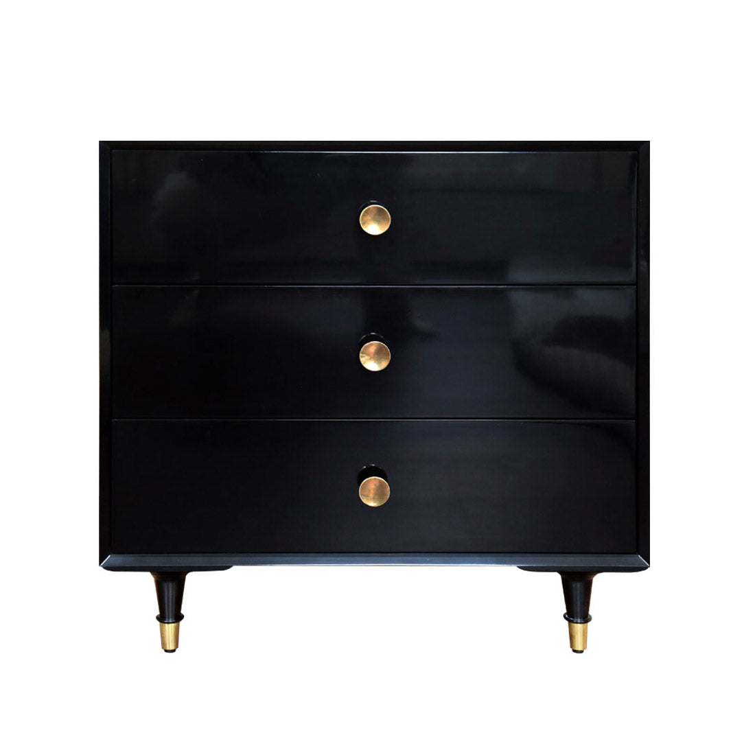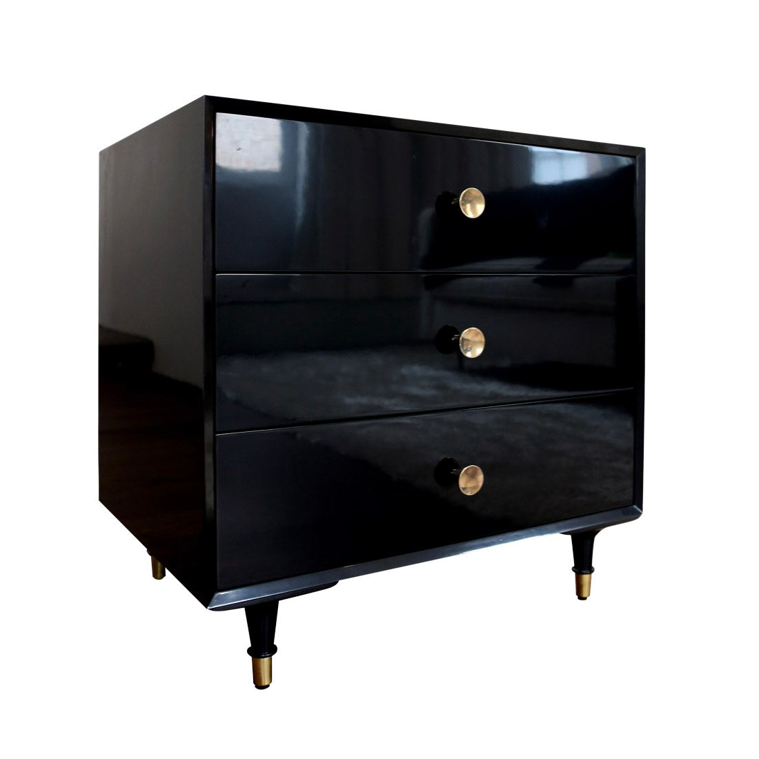 MATERIALS: High gloss black lacquer finish, brass hardware, and natural walnut wood drawers